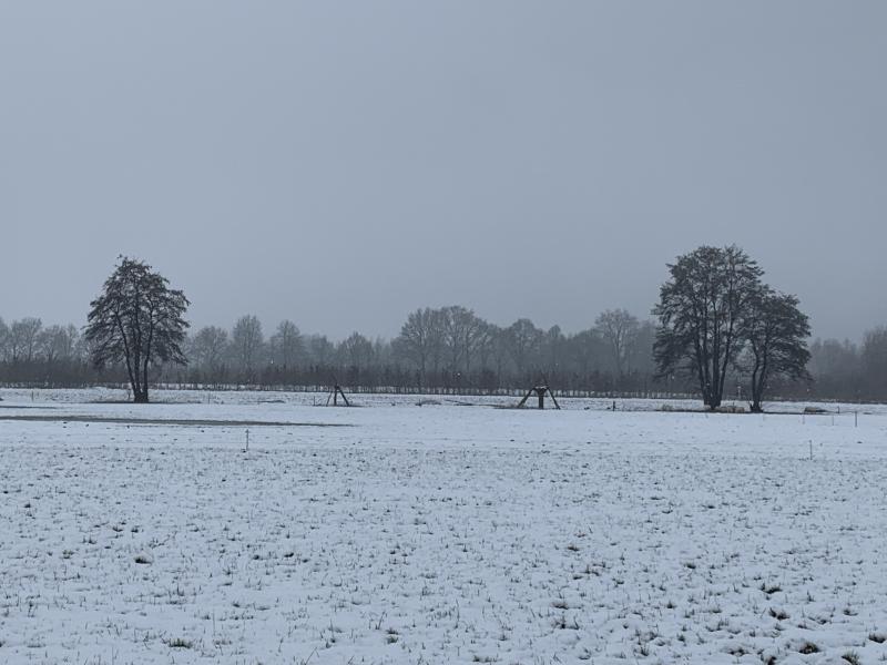 Bedeckter Himmel mit feinem, leichten Schneefall bei -3° im Berner Mittelland.