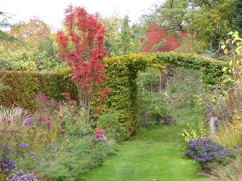 Ja, ich bin kürzlich auch erst wieder drüber gestolpert, wieviele schöne Sorten es gibt. Bisher haben sich die Euonymus auch durchweg als sehr trockenresistent erwiesen. Und so unscheinbar sie über das Jahr sind, umso mehr leuchten sie im Herbst. Ich habe kein wirklich gutes Foto gefunden, aber auf diesem sind sie präsent. Was da über dem Heckenbogen hinten so kräftig glüht, ist der Euonymus-Wildwuchs am Ende des neuen Gartens. ;)