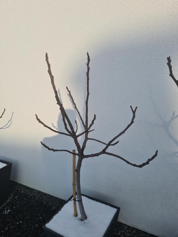 Ich habe vorhin eine weitere im Oktober bekommene Feige kontrolliert. Sie steht bei den andern Kübeln im Gartenhaus, hat ein Vlies um den einzigen, 80 cm aufrechten Trieb und ihr Container steht in einem größeren Kübel mit Erde aufgefüllt. Der obere Bereich des Triebs sieht grünlich aus, die untere Hälfte dunkelbraun.
