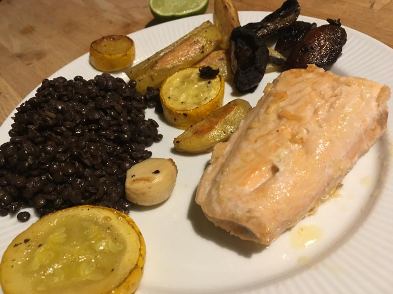 Vorgestern hatte ich die letzten Reste der dicken Rippe, als "Schlammpfanne", wie Floris sagen würde: mit dem Rest der Schwarzwurzel und der Sauce, ein paar Champignons, Zwiebel, Koblauch, Chili, etwas Bacon, Frischkäse, S & P. Dazu Romana-Salat.