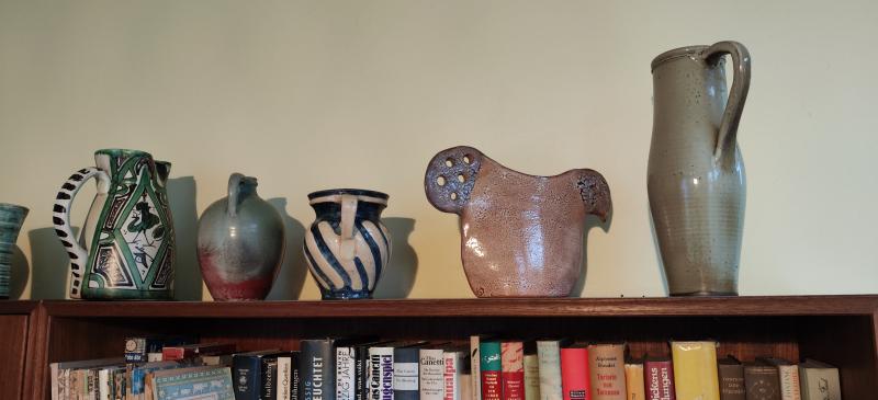 in der unteren Abteilung die Keramik und das Porzellan. Hinter der hoffnungslos kitschigen hellblauen Vase von Rosenthal - wobei es da noch krassere und sehr hässliche Dekore gibt - stehen die "Fickenden Fische", so nannte es ein befreundeter Gast auf einer der Haus Partys vom 200minus5. Ich konnte mich nicht trennen, im Haus am Bach standen die im Regal draußen auf der Terrasse.