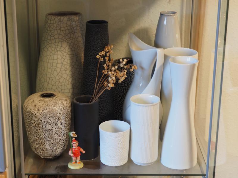 in der unteren Abteilung die Keramik und das Porzellan. Hinter der hoffnungslos kitschigen hellblauen Vase von Rosenthal - wobei es da noch krassere und sehr hässliche Dekore gibt - stehen die "Fickenden Fische", so nannte es ein befreundeter Gast auf einer der Haus Partys vom 200minus5. Ich konnte mich nicht trennen, im Haus am Bach standen die im Regal draußen auf der Terrasse.