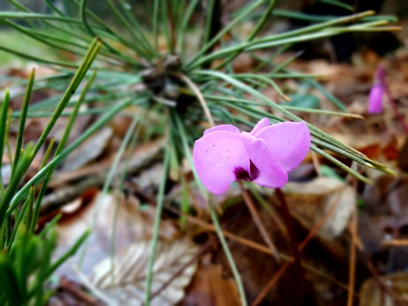Zufallsbegegnung von Cyclamenblüte und vom Winde verwehten Kiefernzweig