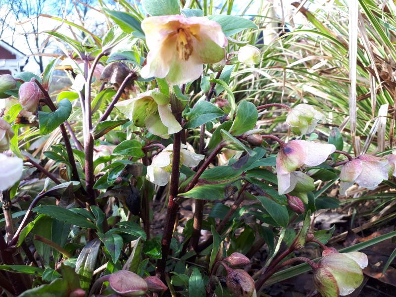 Die von Cassian Schmidt als sehr selten bezeichnete Helleborus sahinii ' Winterbells' habe ich hier. Sie blüht gefühlt fast ständig, hat aber große Probleme mit der Schwarzfleckigkeit.