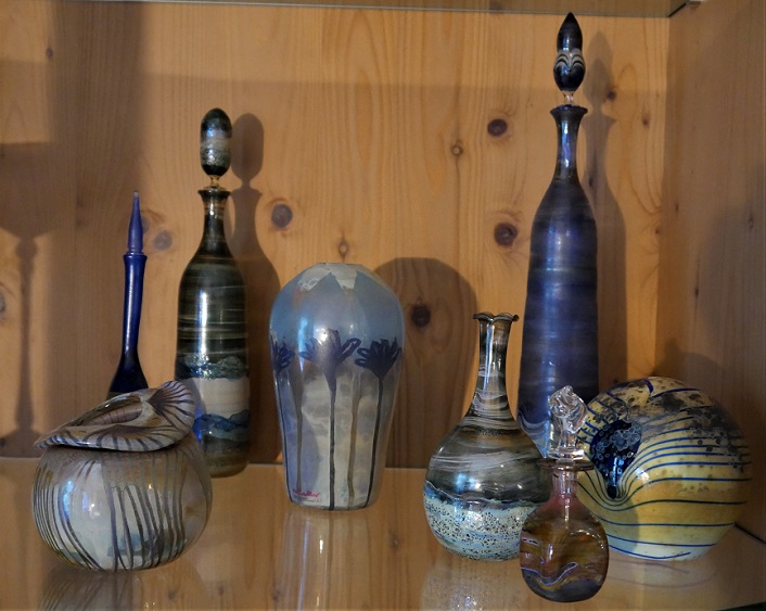 Ich habe nur Glas und in diese kommen keine Blumen. Ganz rechts Briefbeschwerer von der schwäbischen Alb, die hinteren Flaschen von Altglashütten Schwarzwald, dann was aus Freiburg. Eine Fußschale, nicht auf dem Foto, passend zu den 2 Vasen aus Ulm.