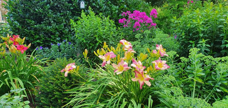 was für eine Farbenpracht. Hier eine Mini-Baby-Taglilie, Geranium Rozanne, Rosen und im Hintergrund eine Hängematte.