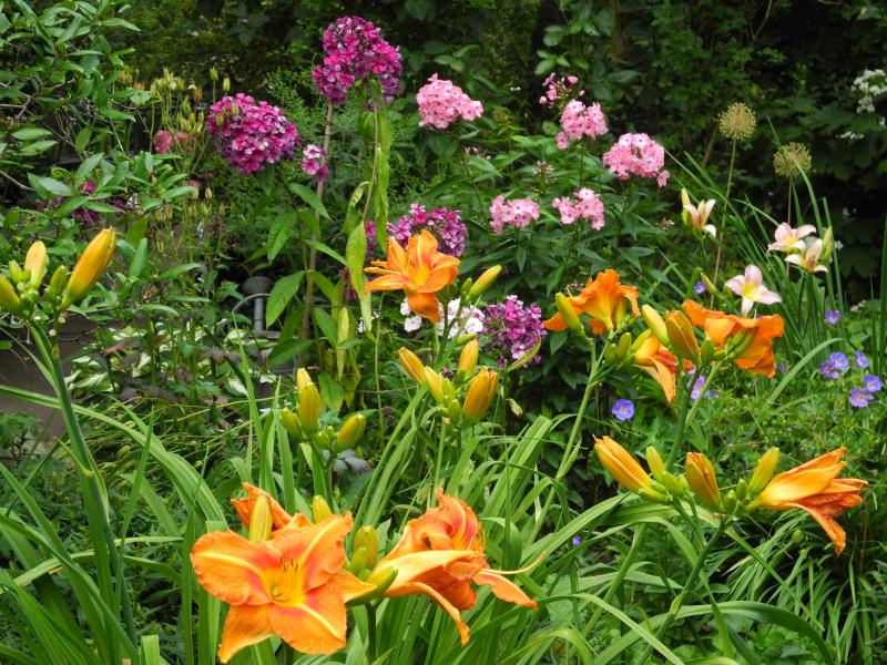 was für eine Farbenpracht. Hier eine Mini-Baby-Taglilie, Geranium Rozanne, Rosen und im Hintergrund eine Hängematte.