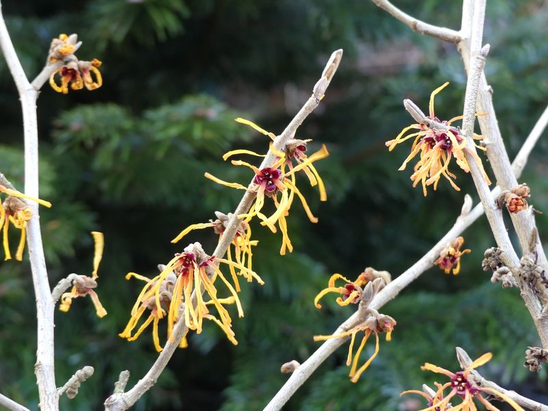 Ein paar Dörfer weiter steht eine in den Sechzigern des letzten Jahrtausends gepflanzte Zaubernuß. Die ist geschätzt vier Meter hoch, ähnlich breit und blüht immer knallgelb aus allen Knopflöchern. Ein Wahnsinnsteil. Würde von diesem Bomber gern mal ein Foto machen, aber ums Grundstück ist eine hohe Hecke und ich sehe nie jemand. (Unerlaubt Grundstücke betreten und Fotos machen, ist hier keine gute Idee.)