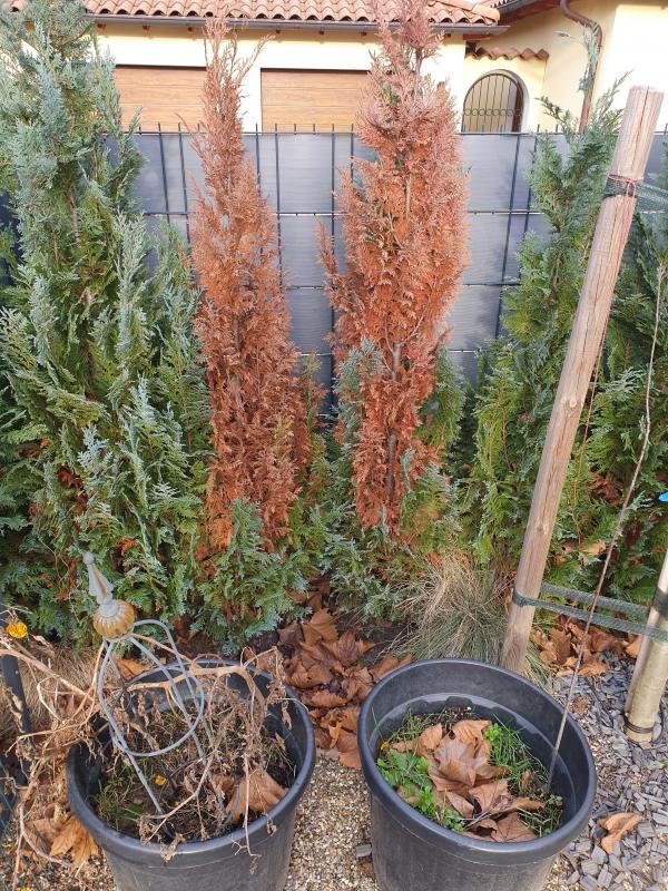 Wie haben bei uns im Frühling 2021 eine Hecke aus Scheinzypressen gepflanzt. Den meisten geht es auch ganz gut, aber wir haben auch ein paar Problemfälle. Diese zwei auf dem Bild haben noch ein paar grüne Äste, aber der Rest ist abgestorben. Das sieht seit dem letzten Herbst so aus.