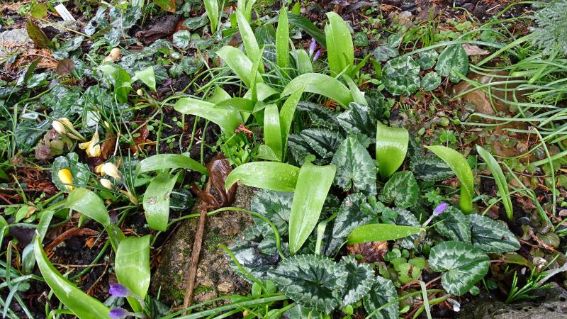 Tulipa turkestanica hat recht dunkles, eher schlankes Laub. In meinem Beet ist auch diese hellgrüne Laub aufgetaucht, wo ich eine Wildtulpen-Mischung versenkt habe, und ich meine, Tulipa saxatilis war ebenfalls dabei.