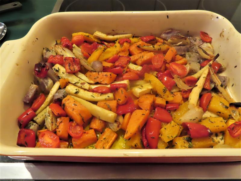 Wenn die Gemüsesorten unterschiedlich lange zum Kochen benötigen, und du sie gleichzeitig in den Ofen schieben willst, kannst das durch den Schnitt/Größe der Stückchen anpassen. Also Paprika und Erdäpfel feiner schneiden als Süßkartoffel und ev. Kürbis. Das erfordert wohl ein wenig probieren.