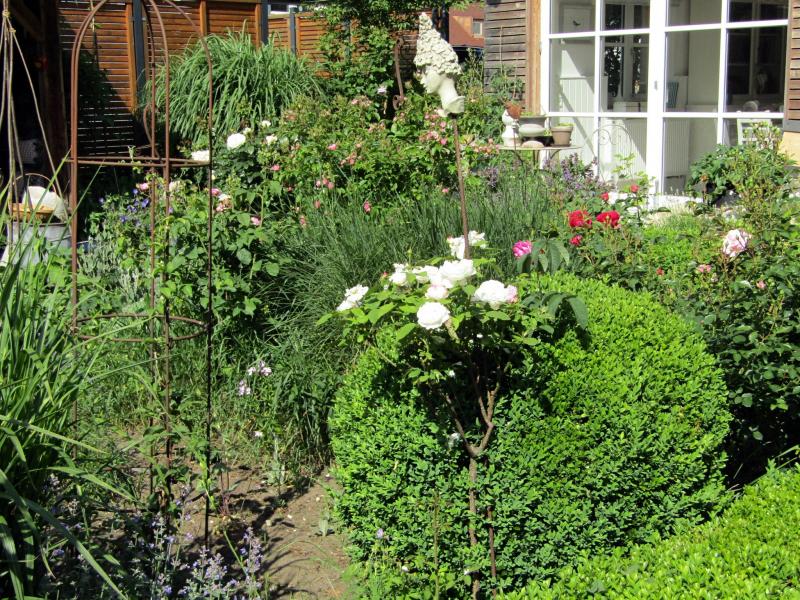@Buddelkönigin, im Hintergrund ist eine helle Rose, Salbei und Rittersporn.