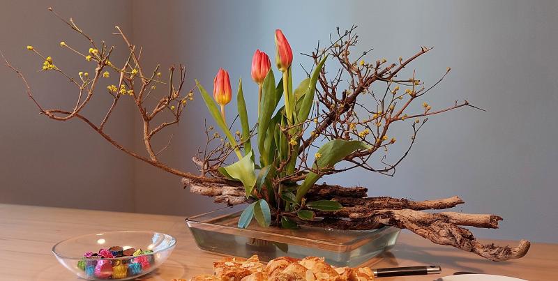 Kornelkirschenzweige aus der Hecke, Efeustrünke (wie vorher) und drei Tulpen. Gesprächsanlässe beim Apfelkuchenessen zu zweit.