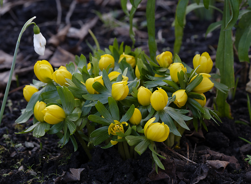 Hier sind die Winterlinge noch nicht in Stimmung. Manche zeigen sich gar nicht, andere lassen wenigstens schon Gnubbel mit leichter Färbung erkennen.