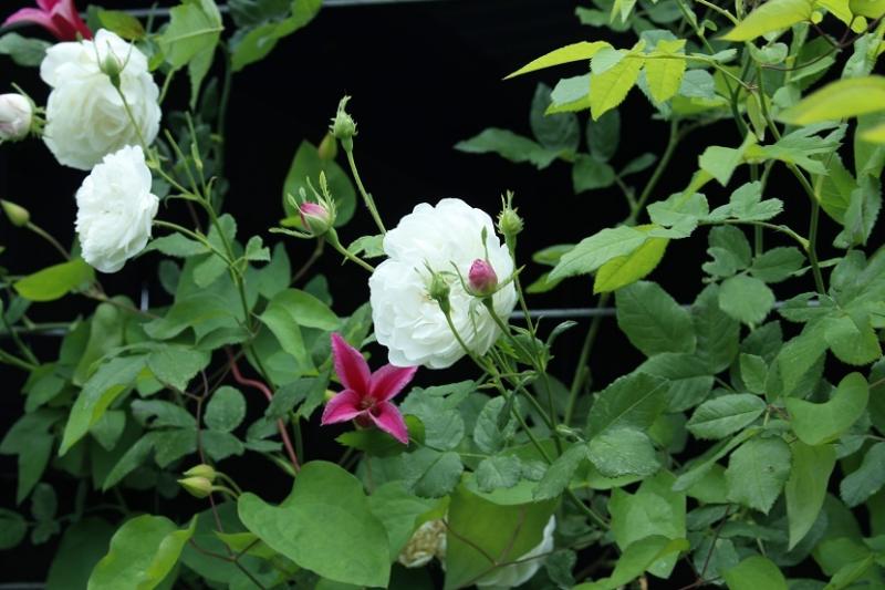 Duftende Rose Unschuld mit Clematis Viticella