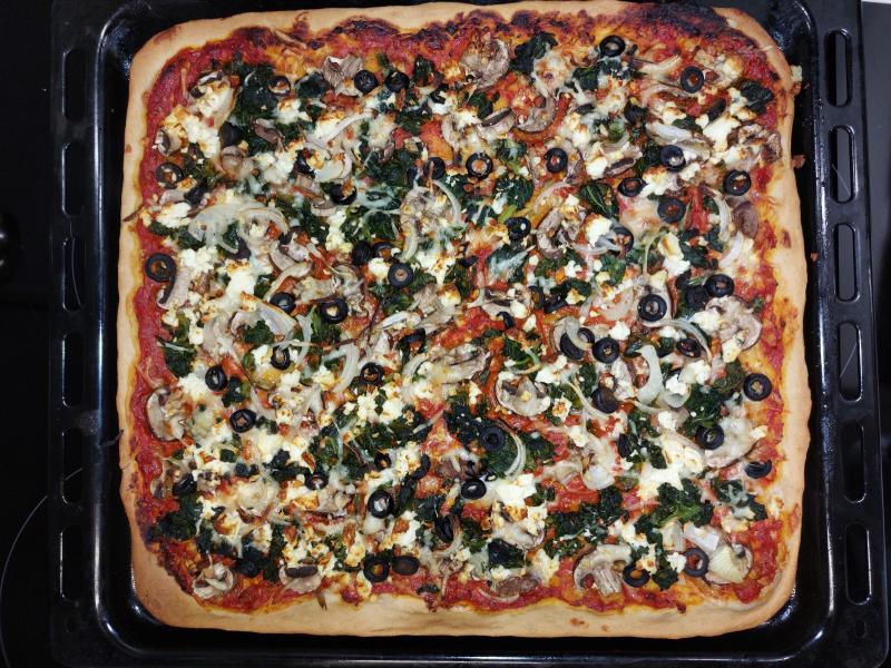 Nach Jahren mal wieder Pizza mit Champignons, Spinat, Oliven und Schafskäse