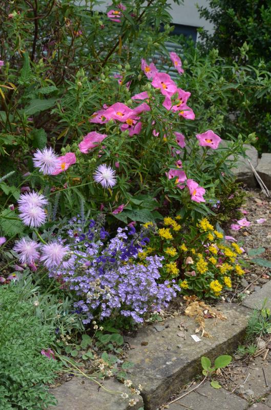 Bunte Steingartenecke mit an dieser Stelle ganz niedrigem Mäuerchen.