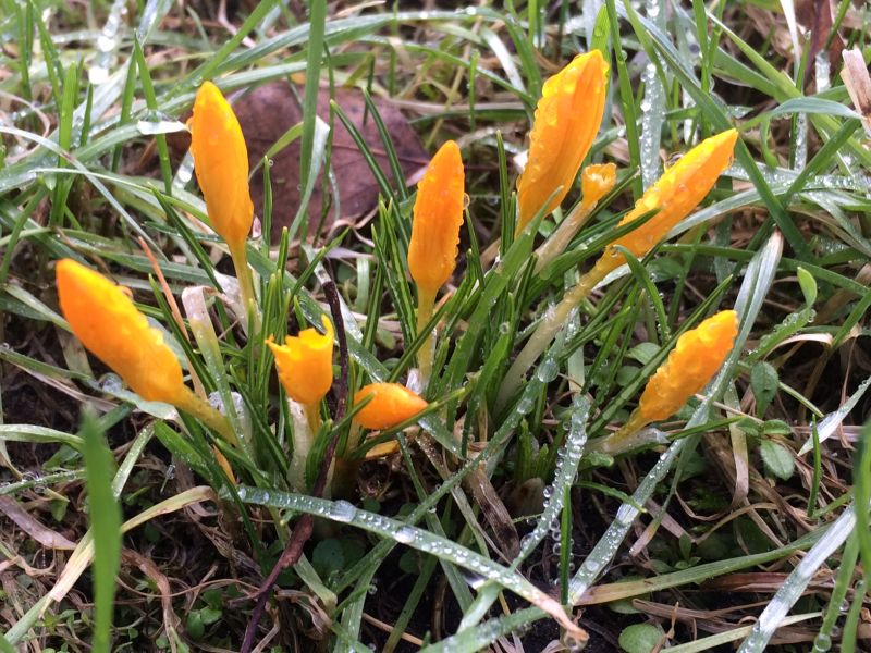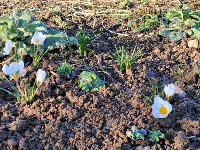 'Snowbunting' scheint tatsächlich ein sehr früher Gold-Krokus zu sein, steht hier aber auch südlich an einem wärmenden Stein. Ansonsten sprießen außer 'De Jager' inzwischen überall die Elfen aus Rasen und Beeten. Es fehlt die Sonne, um sie richtig zu öffnen. Der Schnee lag noch bis zum Freitag.