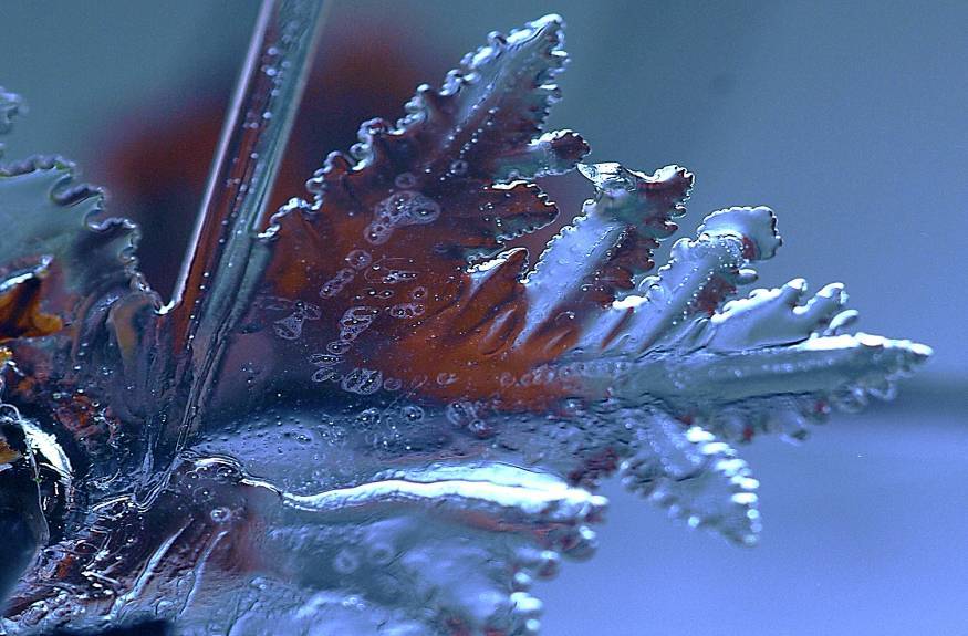 Solch kunstvolle Eiskristalle habe ich nicht zu bieten. Dafür konnte ich im letzten April auf den frischen Tulpenblättern Eisnadeln entdecken.