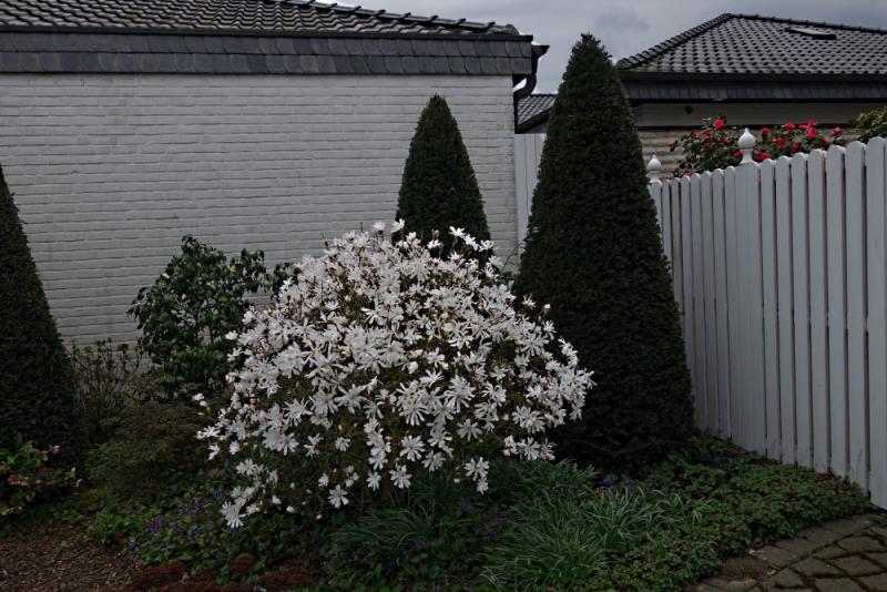 Deshalb ein Bild einer Sternmagnolie aus dem vorherigen Garten. Diese hatte ich zu dicht an unser Tor gepflanzt, sodass ich sie immer zurückschneiden musste. Sie hat trotzdem jedes Jahr üppig geblüht.