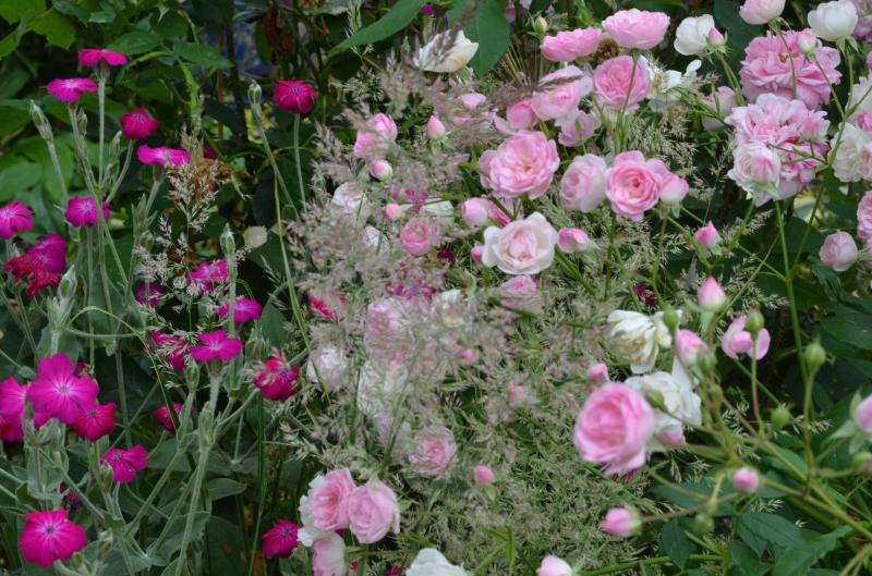 Dann füge ich Philadelphus an. Ganz hinten im Bild ist noch eine "Therese Bugnet"