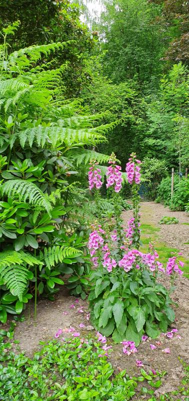 Ich zeige einen Adlerfarn, der zwischen dem großen Rhododendron wuchert. Dann sind auf dem Bild noch Vinca minor, Fingerhut, Vogelbeerbaum , hinten zwei Hortensien ´Annabel´ und Buchen.