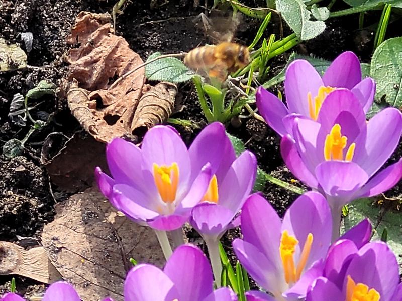 Heute war auch hier der große Tag der Krokusse, bei herrlichem Sonnenschein sind sie geradezu in Massen aufgeblüht, und überall waren sie heftig von Bienen und anderen Insekten umschwärmt. Es summte und brummte im ganzen Garten, und in den Beeten leuchtete es überall farbenprächtig in verschiedenen Lilatönen, auch mehr oder weniger kräftiges Gelb war dabei, dazu weiße Krokusse, und das Blau und Violett der Zwiebeliris sowie die Rosatöne der Alpenveilchen ergänzten den Reigen.