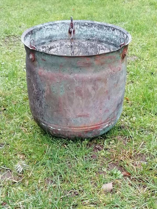 Hallo, ich trödel gern durch Trödelmärkte und fand dabei diesen zum Aufhängen gearbeiteten Kupferkübel. ;D 40 cm hoch, 37 im Durchmesser.