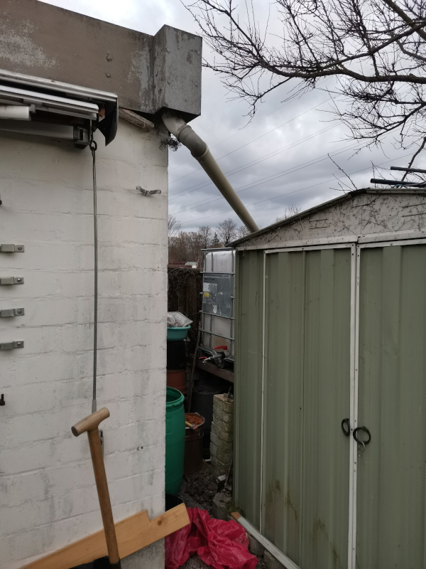 Hier kann man ein bisschen was erkennen. Vom Dach oben gleich weg, schräg runter zur Blechhütte um es dort mit Dachlatten unterfüttert abzustützen, dann 90° Bogen mit weiterem Gefälle zum IBC.