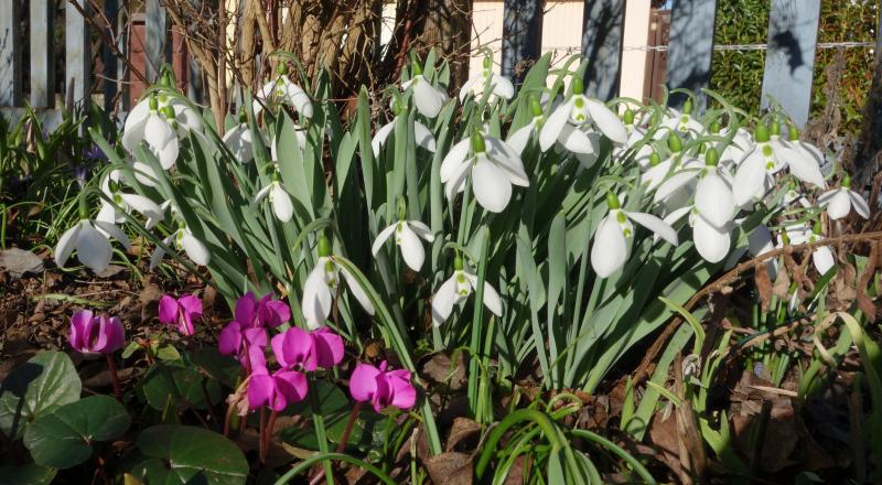 Cyclamen coum mit Phyllitis scolopendrium und allerlei Frühlingsblühern