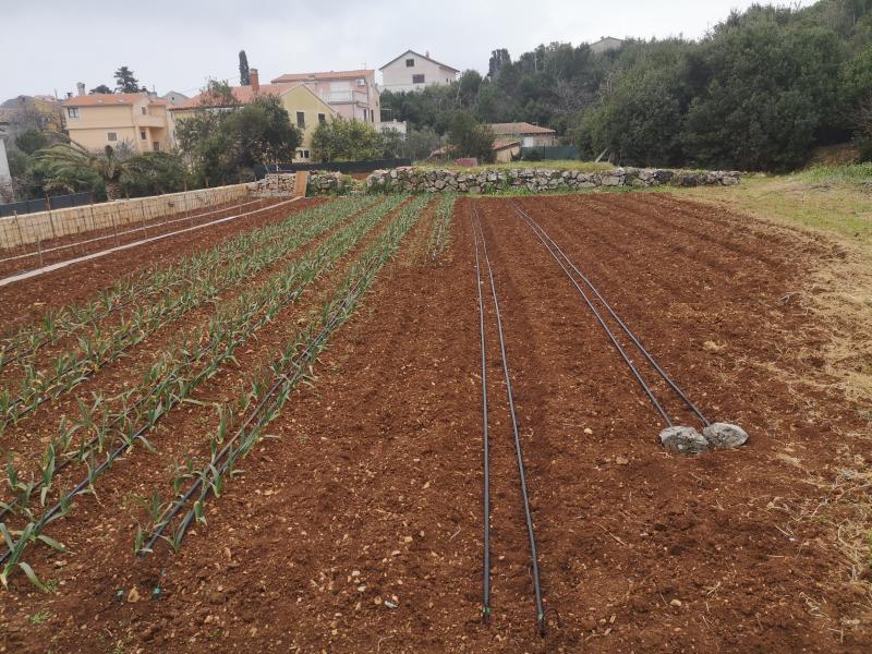 Bild vom Nachbargrundstück. Locker gefräster Boden. Anbau von Zwiebeligem, Bohnen und Tomaten später.