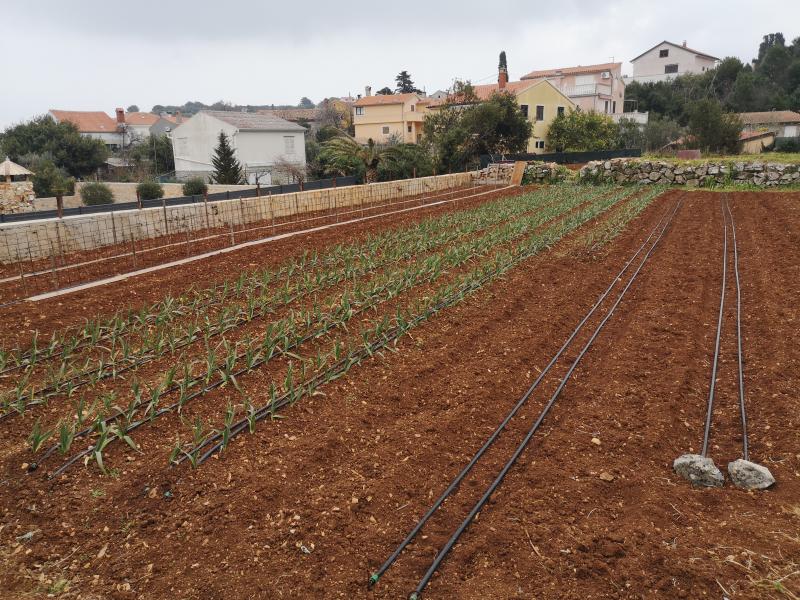 Bild vom Nachbargrundstück. Locker gefräster Boden. Anbau von Zwiebeligem, Bohnen und Tomaten später.