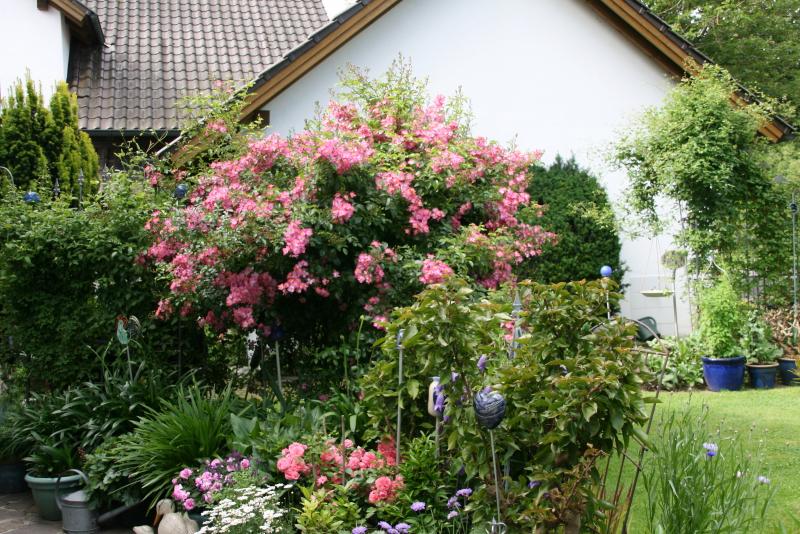 Ich finde, dass in dieses Beet keine starrtriebige Rose wie die Frühlingsrosen oder die ' Golden Wings' passt. :-\ Etwas mit weicherer Ausstrahlung fänd ich schöner.