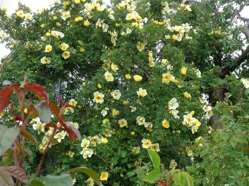 – Rosa ecae blüht gelb, soll aber eher klein bleiben und nur bis maximal 1,5 m schaffen