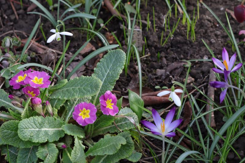 Als die Sonne schien, waren die Frühblüher-Normalos die großen Stars: Galanthus Woronowii zusammen mit dem Krokus Cream Beaty und Cyclamen coum.