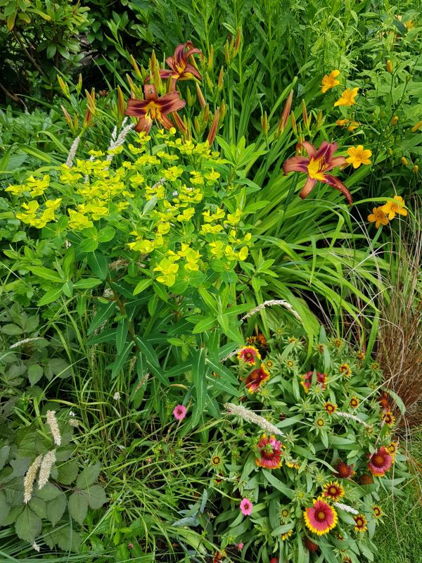 Hier 'Super Yellow' mit Euphorbia 'Black Bird' im Hintergrund.