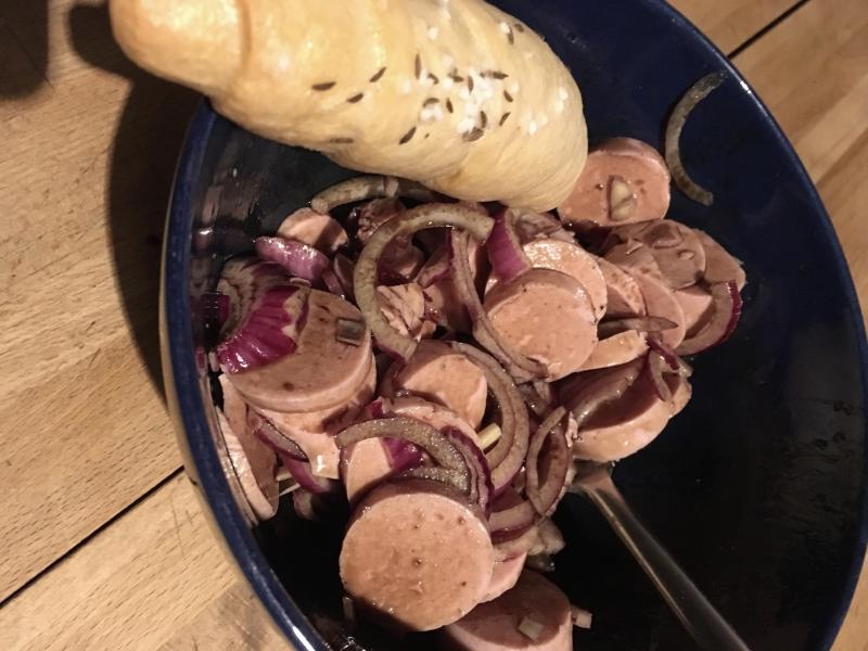 Hier gab es heute gebratenes Skreifilet und bunten Brotsalat (verschiedene Brotsorten, Rote Bete, rote Paprika, blanchierter Grünkohl, Porree, Knoblauch, S+P, Essig, Öl).