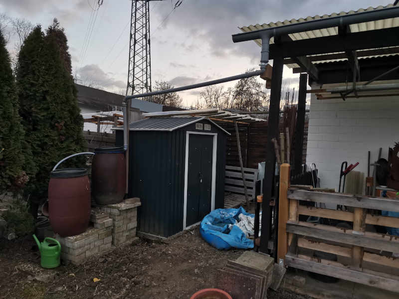Leider laufen die Regenrinnen größtenteils zur Rückseite der Laube. Die Wasserfässer dort sind so schlecht zu erreichen, dass sie de facto nicht genutzt werden, vermodern, laufen über, Mückenbrutstätte...