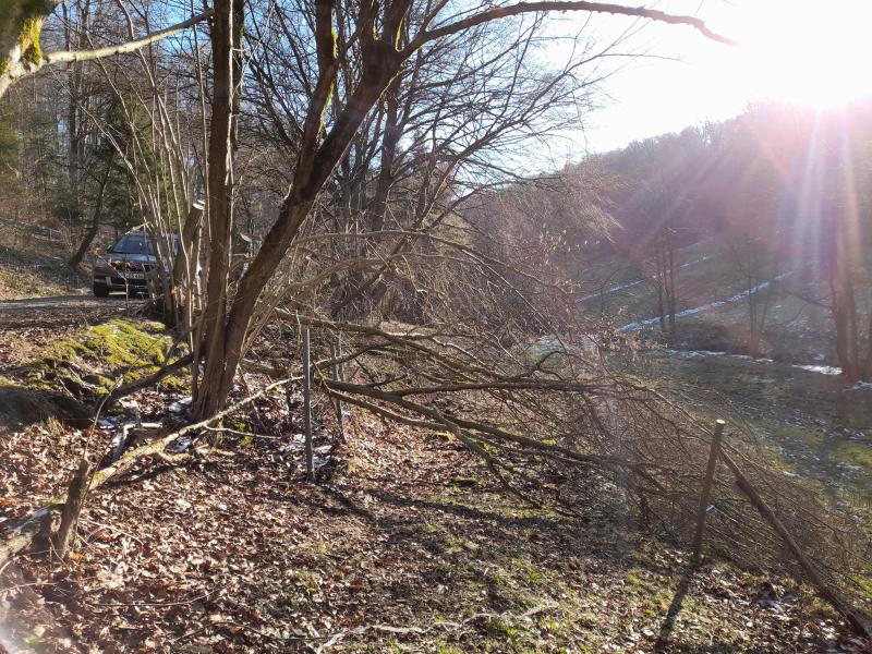 Uralte Haseln machen doppelt Probleme: Sie enthalten tolle abgestorbene Stämme, die für Spechte echt toll sind. Sie brechen nur irgendwann unkontrolliert runter und ich kann mir mit 3 Wölfen keine Zaunfehler leisten. Aufgehalten hat hier nicht nur die Mikadostruktur jener Gewächse, sondern dass der Wald auch schon schwungvoll in die Fläche gedrückt hat. Da stresst das Satellitenbild also auch noch. Es hätte übern Bach mindestens noch 5 mal soviel Pflegebedarf gehabt. Da ich keine Flügel habe kam ich aber nicht übern Bach.