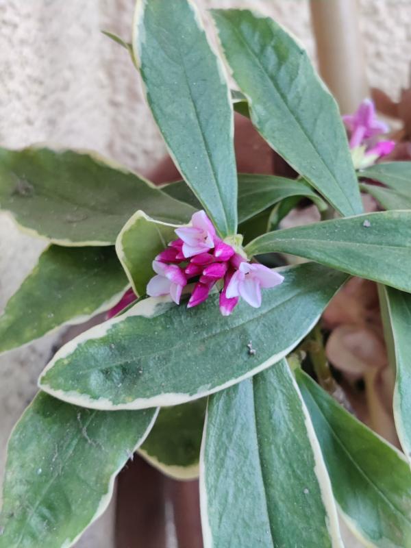 Schon seit ein paar Tagen blüht Daphne odora 'Aureomarginata'. Er steht im Kübel, soll eigentlich über den Winter in den Stall, weil grenzwertig winterhart. Diesen Winter habe ich das Einräumen vergessen, er steht auf der Terasse an der Hauswand, was offenbar passt.