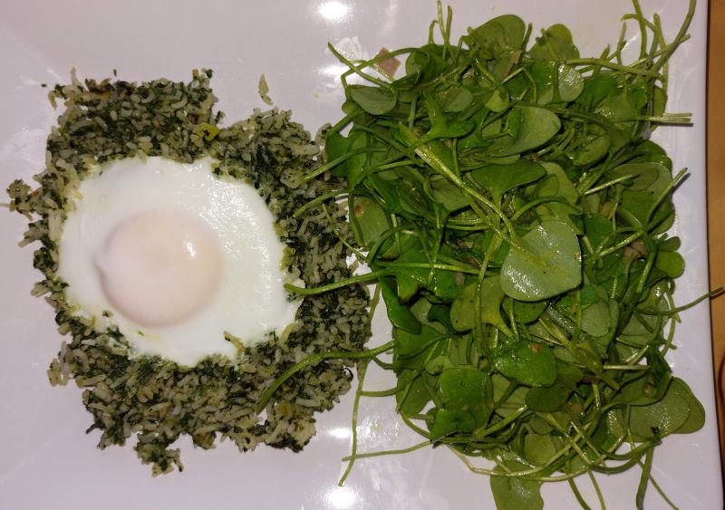 Gestern gab es Restereis mit Spinat und Spiegelei, dazu Postelein