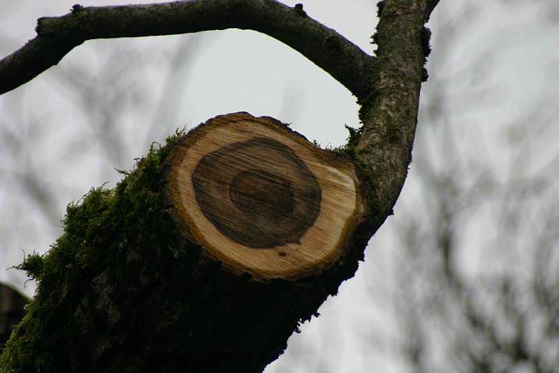 ... und so ein Ast mit "Weißfäule".Alles innerhalb des "schwarzen Rings" ist wie Styropor, gesund+stabil ist lediglich das "Aussenrum" ... und wie instabil die Statik dieses Astes ist, läßt sich unschwer erahnen.