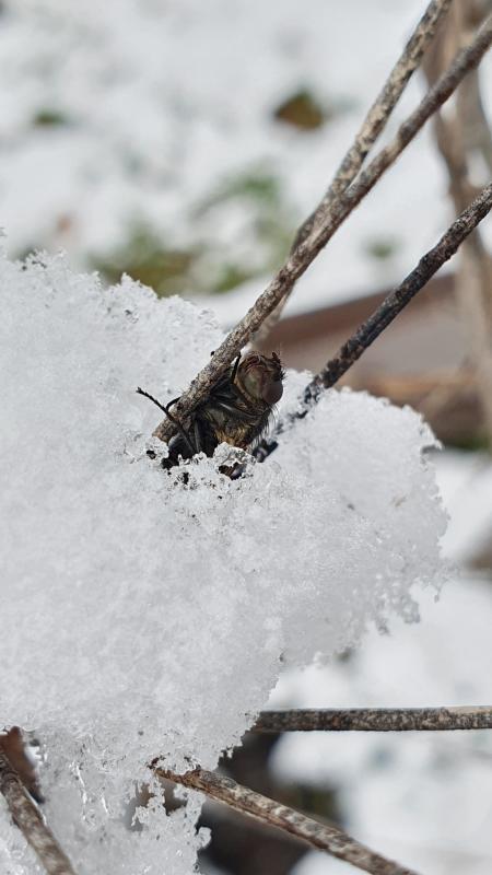 Nachdem es in der Nacht von Samstag auf Sonntag etwas Schnee gab, war ich kurz im Gemüsegarten und da ist mir zufällig eine eingeschneite Fliege aufgefallen (die aber noch lebte) - faszinierend :)