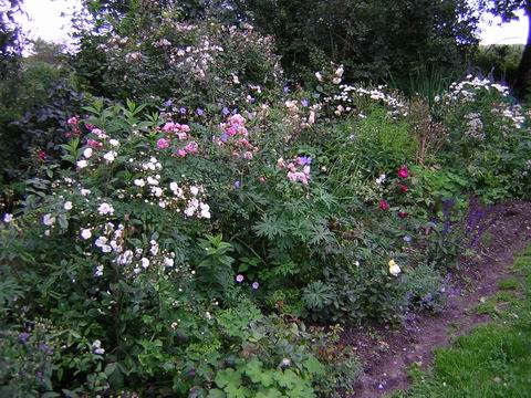 Dieses Bild ist leider zu weit weg, hinten Trier rechts Buff Beauty, davor Kardinal Hume, der vom Wuchs und von der Farbe wunderbar zu Moschatas paßt, meine ich. Leider blüht er dort grad nicht :o