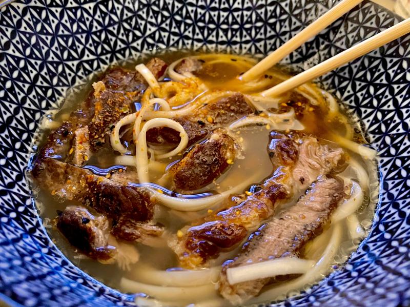 nach dem schneeregen im garten gab es heiße chilischarfe gemüse-fleisch-bouillon mit udon-nudeln und krossem doppelt gegartem schweinenacken