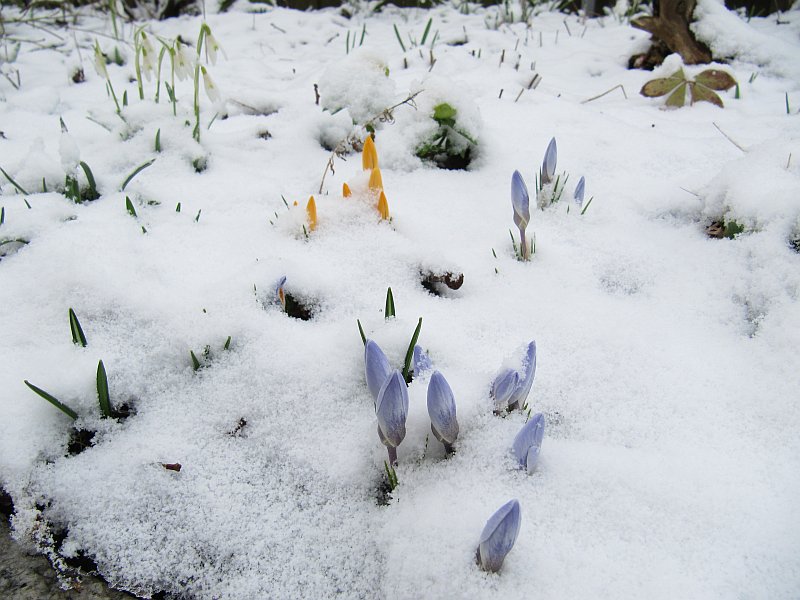Scilla gefällt der Schnee nicht. Die machen schlapp. Der Dauerregen geht schon wieder in Schnee über. :'(