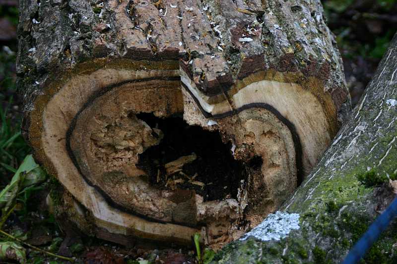 ... und so ein Ast mit "Weißfäule".Alles innerhalb des "schwarzen Rings" ist wie Styropor, gesund+stabil ist lediglich das "Aussenrum" ... und wie instabil die Statik dieses Astes ist, läßt sich unschwer erahnen.