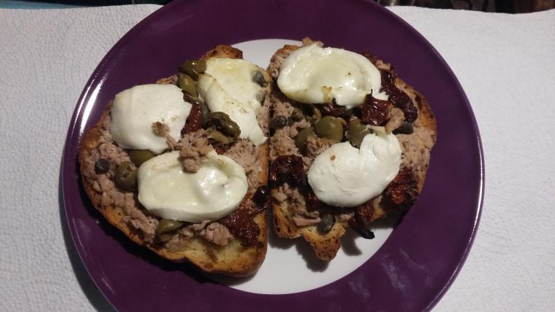 Gestern gab es leckere Crostini: Thunfisch, Oliven, Kapern, getrocknete Tomaten und Mozzarella.