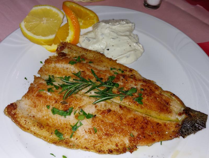 Ich hatte gegrilltes Fischfilet mit Salat und Knobikartoffeln, GG BBQ Rippchen mit Pommes und Salat