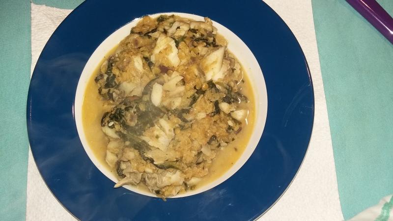 Dhal (gelbe Linsen, Knoblauch, Peperoncino, rote Zwiebel, Garam Masala) mit Spinat und Seelachsfilet.